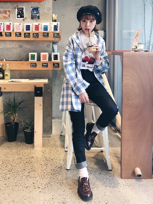 淺藍色格紋外套,內搭T恤和牛仔褲,休閒率性的風格在搭上具有女孩味的貝雷帽,中性混搭可愛,創造出高回頭率的亮眼Look!
