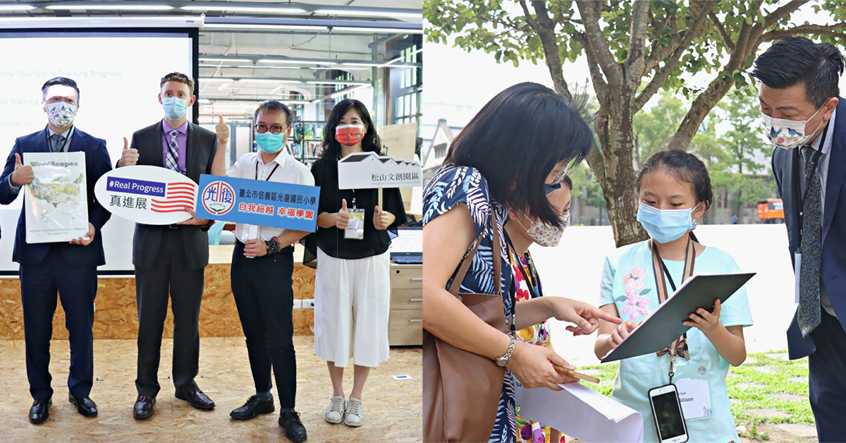 中秋節前夕,松山文創園區有一群小小貴賓來訪,執行特別的任務!為了讓外國貴賓更加認識這處擁有82年歷史的菸廠,松山文創園區特別與美國在台協會(AIT)及臺北市信義區光復國小合作,於昨日(9/15)下午舉辦「2021松山文創園區英文小導覽員工作坊」。由美國在台協會外交官Kyle Morgan、Brian Chen及Lynn Ruggles 擔任活動講師,與光復國小9位小導覽員,透過用英語導覽松山文創園區,進行語法及發音指導,不但提升英語能力,也認識在地文化,促進文化交流。