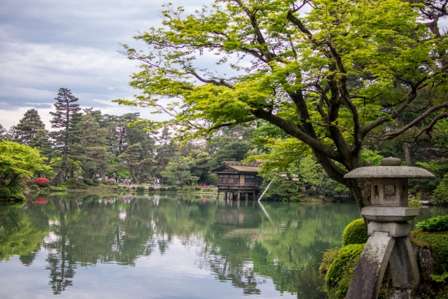 位於石川縣金澤市中心的兼六園可追溯歷史到西元1583年,這裡是與加賀藩本家前田家系有淵源的地方,這塊土地歷經過寺院與役所等使用,直到1860年才形成現在看到的庭園模樣。兼六園在江戶時代時,就已經是相當有代表性的庭園,在總面積11.7公頃的腹地內,可以看到美麗的池塘與流水穿插其中,座落在池塘附近的小山、涼亭與茶屋也相當有氣氛。