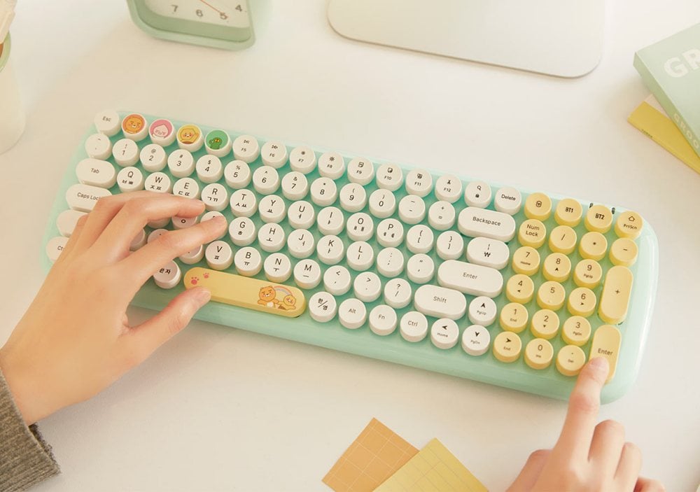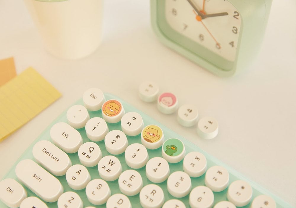 KAKAO FRINEDS推出的復古鍵盤以薄荷綠為底,搭配白、黃鍵帽,整體走清新繽紛的撞色設計。透過USB或藍牙即可連線,最多可配對3台裝置。鍵盤最大亮點就是,能把F1~F4換成萊恩、桃子、春植與Coz圖案,可愛造型一秒開啟少女心。
