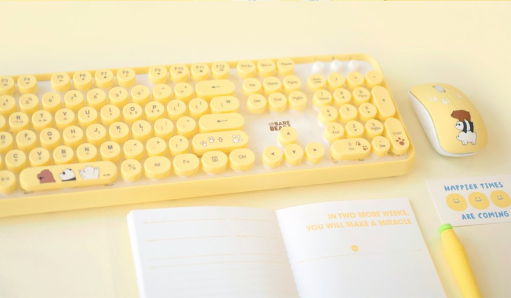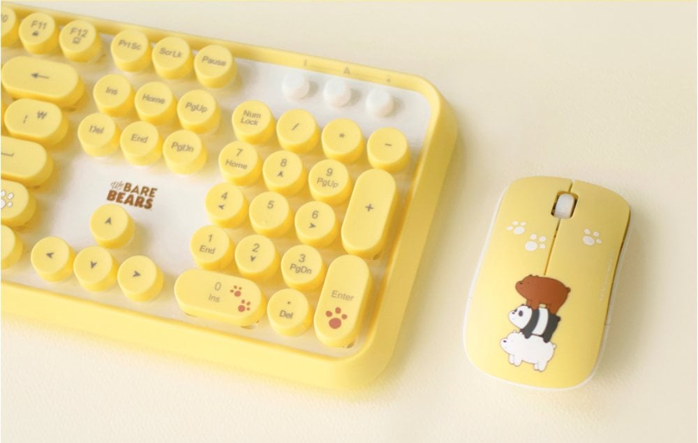 卡通頻道《熊熊遇見你》也來囉~組合包含復古鍵盤與滑鼠,共有深灰、暖黃2款,不僅派出胖達、阿極與大大登場賣萌,在部分鍵帽上還特別使用熊腳印裝飾,營造他們留下的痕跡,風格十分療癒,打字時會忍不住一直狂看呀!(笑)