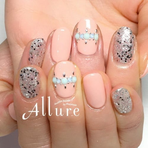 膚色比較白的妞妞,不妨選擇加入白色比較多的哈密瓜色,搭配一點銀色亮片指甲油,氣質又能透露出你是有一套屬於自己的搭配想法的指彩就完成囉!