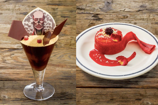 食物的部分也很多花樣,艾連奶油咖哩雞套餐、里維紅茶烤雞套餐、訓練兵團漢堡排套餐,還有超大型巨人的芒果布丁及以米卡莎紅圍巾設計的桃子蛋糕,小細節和人物的特色都有顧到,還有每個角色的飲料杯,超值得買一杯帶回家收藏啊!