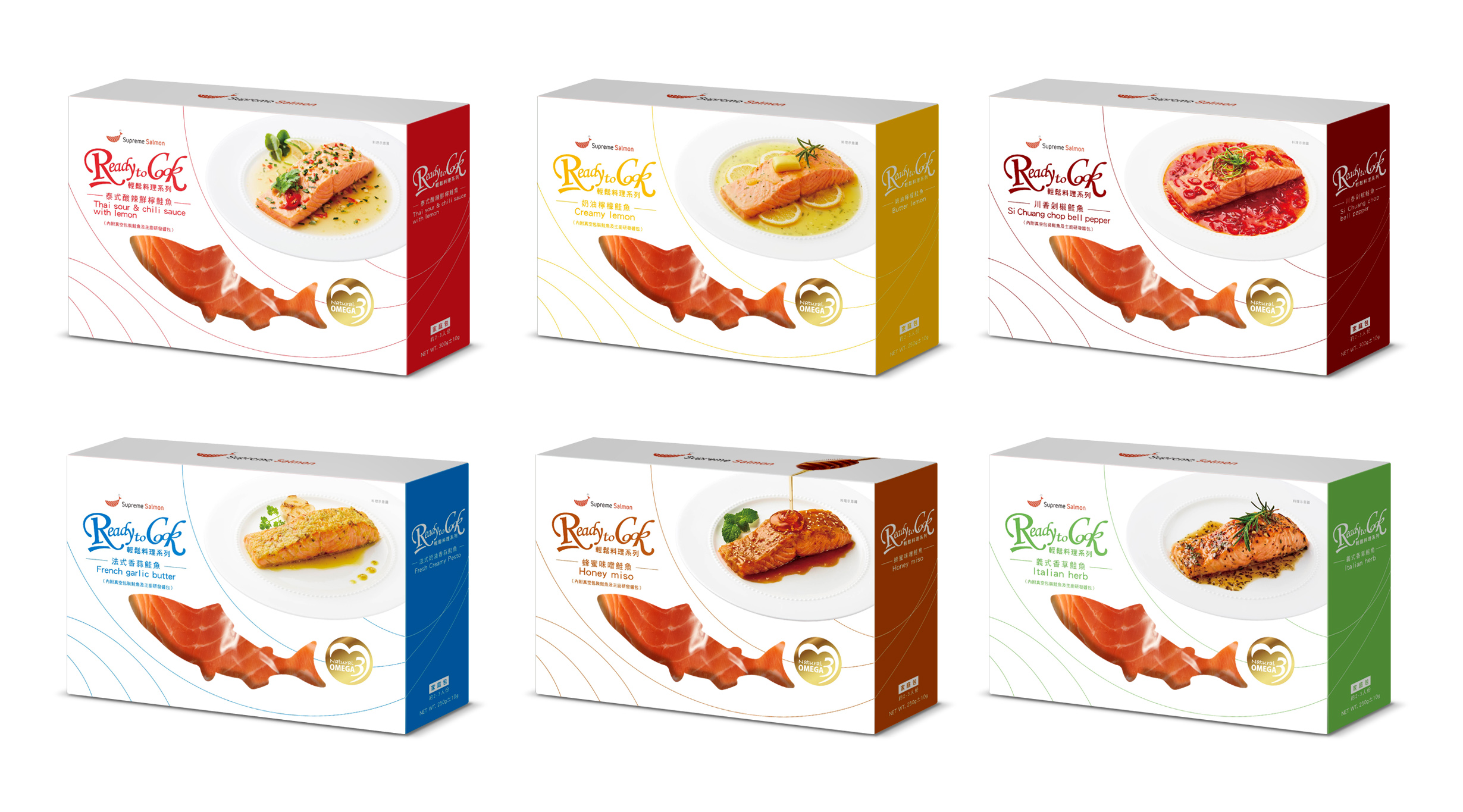 美威鮭魚此次推出的「輕鬆料理系列」,除了改以急速冷凍、真空包裝方式保留鮭魚的鮮甜口感,與市場同質產品做區隔外,在全新的包裝上也看得出美威對鮮度的堅持,採用純白的盒裝呈現北歐簡約、高雅的風格,在盒子正面部分則特別挖空設計成鮭魚的形狀,並以透明封口膜透視新鮮鮭魚,此外,在側邊則以顏色區分不同口味,種種巧思不僅方便讓消費者清楚辨識,更展現對品質嚴格控管的信心。