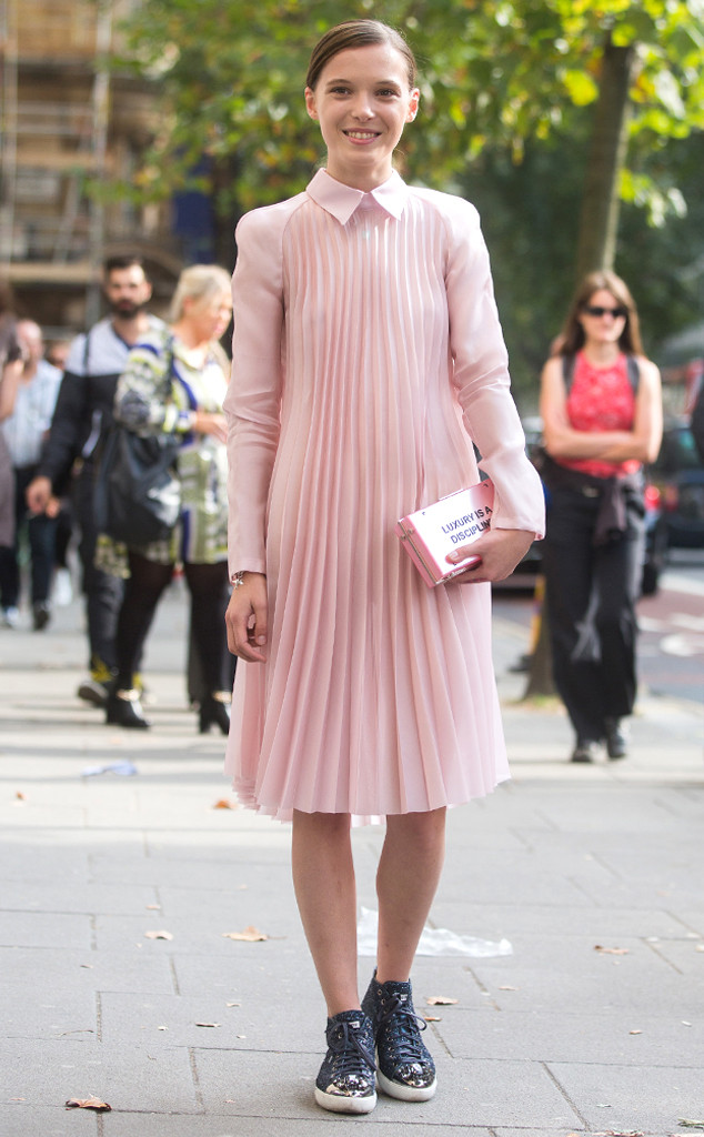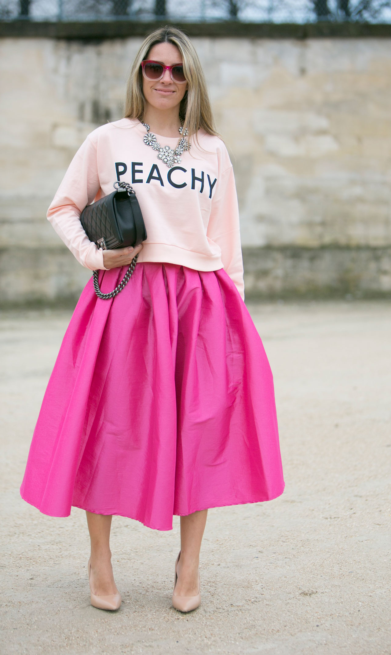 粉紅色洋裝是最佳入門款,搭配一雙帆布鞋,會顯得相當可愛。另外,如果覺得整身粉紅色穿出去會太害羞,可以選擇不同材質的粉紅色單品來搭配,例如粉紅色針織衫加上粉紅色蕾絲及膝裙,不同材質、不同深淺,就會顯得很有層次。