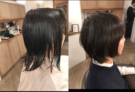 一般我們的髮量上下段都是一樣的厚度,不過為了讓結衣短髮可以俐落收尾,製造出可愛的弧度。因此需要從內層調整髮量,做出中間厚髮尾薄的效果。