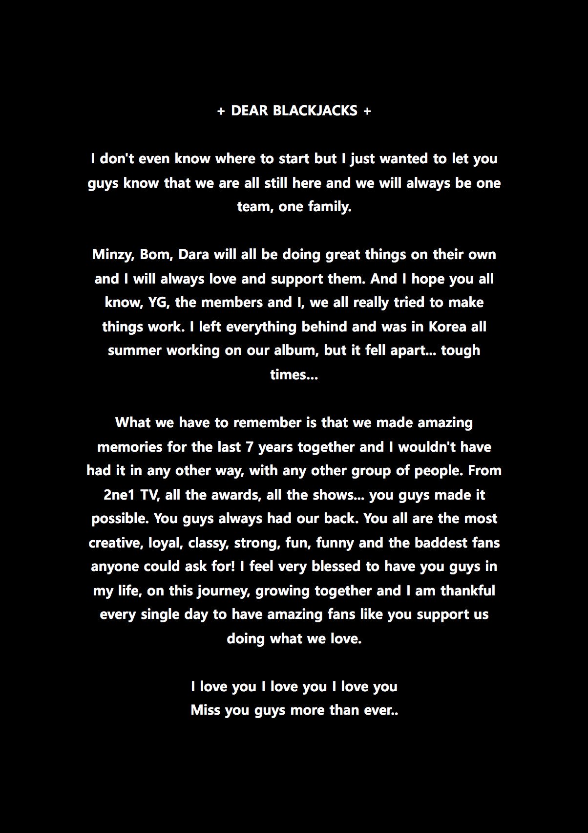 CL也於11月29日當天在推特上寫了一封信給親愛的Black Jack們:「我根本不知道要如何說起,但我只想讓你們知道我們還是在這裡,我們永遠都是2NE1,都是一個家。Minzy、Bom、Dara每個人都會帶給大家更好的作品,我也會一直守護並支持他們。我希望你們可以知道YG、每個成員和我,我們都試過希望事情會很好。我拋下所有事物,整整一個暑假都在韓國製作我們的專輯,但隨著時間地推移,事情就變成這樣了...」、「我們需要記住的是過去整整七年的相處,我們有了很多美好且無法取代的回憶。從2NE1 TV、所有的頒獎典禮、所有的表演活動...你們總是創造了許多可能,你們總是在我們的背後支持我們。你們是最有創意、最死忠、最優秀、最堅強、最活潑、最有趣、最Baddest(棒)的粉絲!我非常感謝我的生命旅程中,我們一起成長。謝謝過去每一天有像你們這樣的粉絲支持我們做我們喜歡的事情。」
