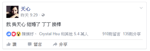 一小時過後,林宥嘉打出「她說好:)」並放上自己求婚成功,和丁文琪深情擁抱的照片。(甜死人啦!)藝人們紛紛搶給祝福,身為師姐的Selina說:「太美太美啦!」徐佳瑩、黃子佼、曲家瑞等人也獻上「恭喜」。傳出決定要結婚的喜訊後,妞編輯實在等不及看到林宥嘉穿著西裝,牽著丁文琪的手走上紅毯的樣子,光想像就覺得好幸福啊!