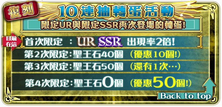 只要在回憶轉蛋專用的轉蛋機進行10連抽,便可以累積不同的優惠,累積滿4次十抽將可以獲得一次免費十抽的機會,期間每次十抽都能夠累積計量表。只要計量到達100%及可自選自己喜歡的角色卡牌喔!