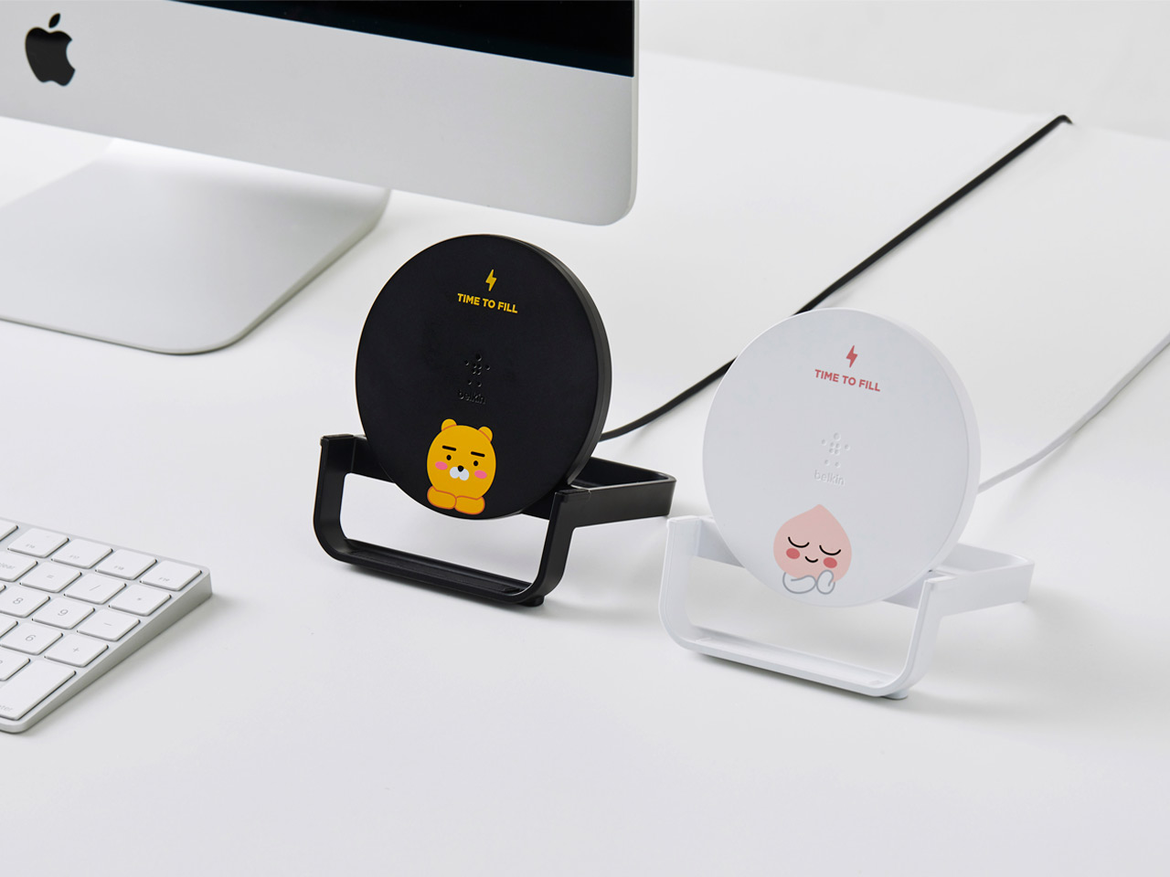 無線充電盤也是以萊恩與桃子為主角,底部特地設計成立架,手機可以橫放或直放充電,如此一來就算充電時要繼續使用手機,也不用將手機&充電盤一同拿在手上,放在桌面即可滑手機或追劇。
