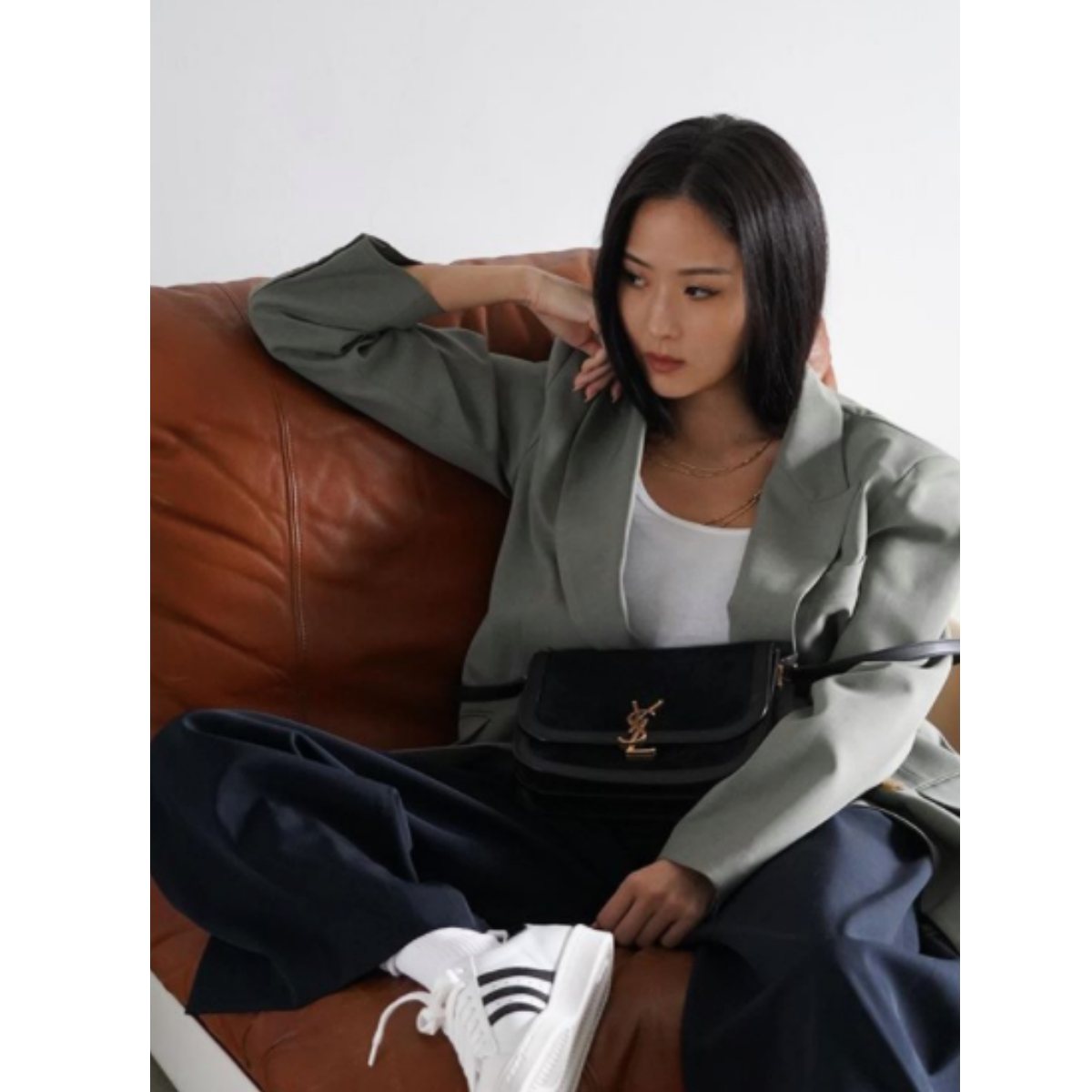 SAINT LAURENT在今年秋冬推出全新SOLFERINO皮革方形肩背包,也因為BLACKPINK成員ROSÉ一揹爆紅,孫芸芸曬出的則是非常有秋冬季節感的絨布款式,這款包從皮革到麂皮、帆布拼接都有,而且內裏容量很耐裝,搭配經典搶眼的YSL LOGO旋轉鎖扣,極簡實用!