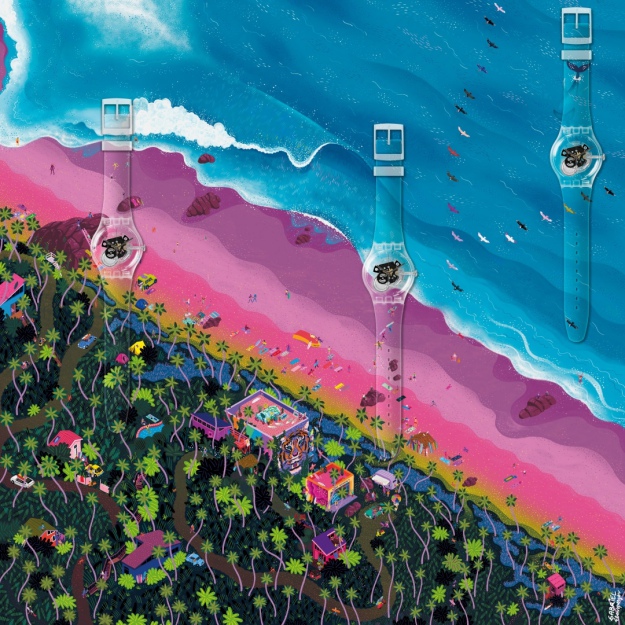 另外也找來美國衝浪女王Courtney Conlogue推出「ProTeam」畫布,由智利藝術家Gabriel Ebensperger畫下Courtney喜愛的印尼峇里島和美國加州馬里布海灘,碧藍的海洋、粉色的沙灘和綠油油的草叢,撞色風格強烈,印在錶上一定會很特別!