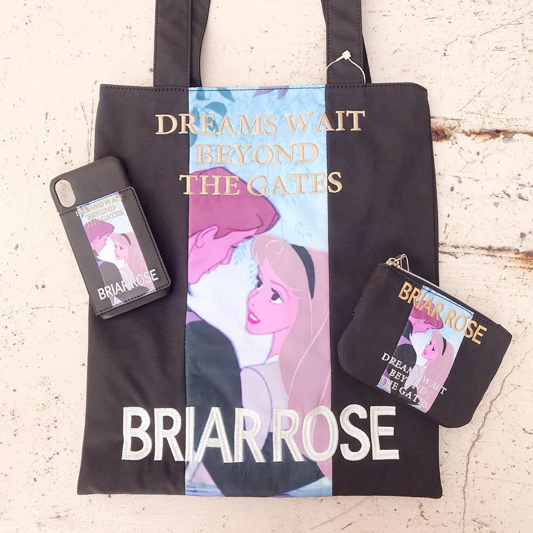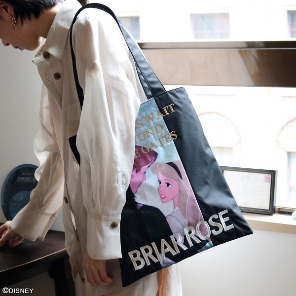 睡美人款主色是黑色,以奧蘿拉公主與菲利浦王子相視的動畫片段為圖案,並繡上了「Briar Rose」(睡美人的英文片名),既百搭又有個性!手提袋的尺寸是A3,裡面還有兩個口袋可以放東西,收納空間算大。