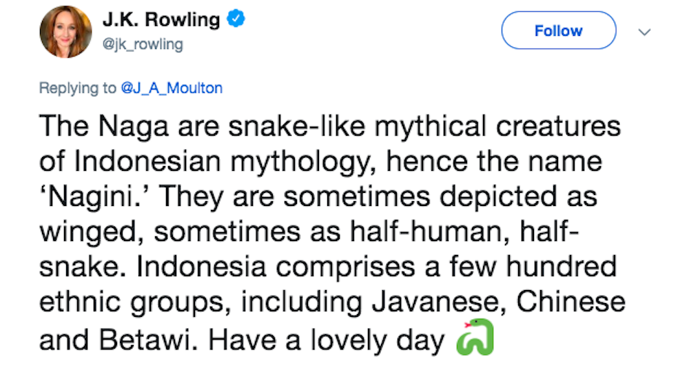 有時候,或許是人紅是非多,知名作品總是會被放大檢視,但針對觀眾這樣的疑問,J.K.羅琳親自在她的推特上回覆一位有點微爆氣的粉絲相關的質疑。J.K.羅琳表示:「娜吉妮(Nagini)這個名字是源自於印尼神話故事中的蛇型大神那伽(Naga),祂們有些時候被描繪有翅膀的蛇,有時侯則是半人半蛇。並且印尼是一個由上百個民族組成的國家,包含爪哇人、華人、貝塔維人。祝,有美好的一天。(並且搭配蛇蛇表情符號XD)」