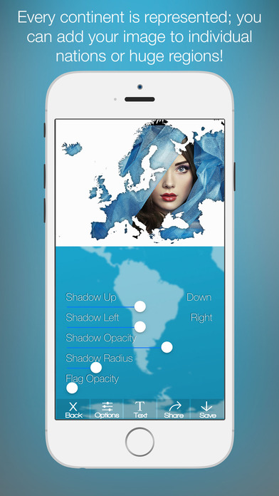現在就把照片融入喜歡的國家地圖中吧!內建180個國家地圖與國旗,並可調整照片透明度、在照片加上文字,讓照片變得更有國家特色就靠它囉!