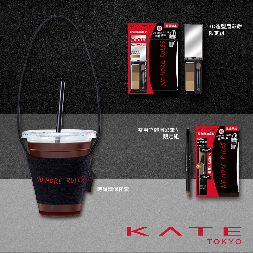新的一年,KATE特別鎖定運勢關鍵──眉毛,將兩款經典眉彩結合獨家環保杯套,推出限定組回饋消費者。包括:一盒中有濃、中、淡三色的「3D造型眉彩餅」(EX-4亮棕系、EX-5棕色系),打造自然柔和的漸層眉色,或隨心創造兩側鼻影,營造出立體深邃眼部印象,怎麼用都好用。雙頭設計的「雙用立體眉彩筆」(BR-1明亮棕、BR-3自然棕),軟硬適中的扁平筆芯粗細線條輕鬆描繪,眉筆端可加強毛流線條,勾勒鮮明眉型,眉粉氣墊棒端則可輕鬆暈染出自然立體眉。上述兩款經典眉彩特別推出超值限定組,隨盒附贈no more rules個性環保杯套,以KATE經典的黑Î紅配色展現率性風格,讓妳將「美眉」與環保時尚一次Get!