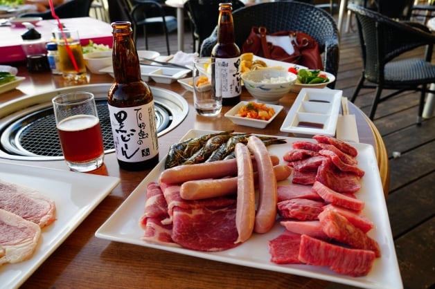 如果想邊看海邊吃「石垣牛」的話,請妞妞們一定要選飯店內的「SEASIDE BBQ KACHIBAI」,妞編輯這次選的是6000日幣(稅未入)的「Ishigaki Beef Plate」,總共有切片石垣牛(100g)、本日石垣牛精選部位(100g)、熟成黑豚肉(50g)、沖繩豬肉香腸(1根)、石垣島蝦(2尾),全部採自助式,湯飯、蔬菜和沙拉皆吃到飽,每天晚上七點(P.S.週三為晚上七點半)還有精彩表演秀,炎炎夏日,這時候再來一杯沁涼入脾的「石垣島啤酒」,絕對是天堂!妞編輯覺得份量很大,飽足感十足,而且肉質真心入口即化,是會上癮的滋味~