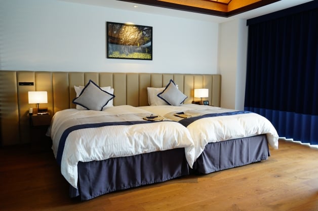 這次妞編輯入住的是第三棟三樓的「雙人海景套房」,總共有兩種風格,分別是「沙發」和「沖繩正方形榻榻米」,沙發型最多可住三個人,而榻榻米型最多可住到四個人。三樓天花板挑高,整體給人一種典雅又大方的舒適感,設計再加入大海的湛藍色調和木編織的天花板等海島國家元素,採光和空間感一次滿足!其中具特色的是飯店跟藝術家進行合作,以「石垣島」作為概念發想,創作出一幅幅專屬於石垣島才有的藝術畫作,且唯一陳列在「新館North Wing」房間內!