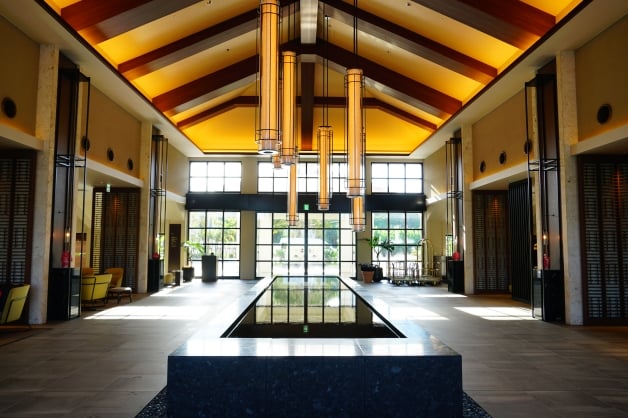 飯店入口處有沖繩守護神「琉球獅(風獅爺/石獅)」(張嘴的是雌獅,閉嘴的是雄獅)威風凜凜地坐著迎接大家,入內後可以看到重整後的大廳變得金、碧、輝、煌,有著8公尺的挑高和沁涼的水池設計,陽光從正門和前往泳池的入口灑進來,給人一種開闊明亮感,同時更設有「機場/飯店接駁車」,上下車位置分別為機場國際線出口、飯店專用出入口,新石垣島機場車程時間約25分鐘,石垣港車程時間約15分鐘!