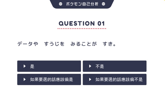 每次在臉書上看到「個性分析」這種小遊戲都忍不住玩一下XD,現在寶可夢官方也推出了自我分析遊戲,妞妞們只要回答16個問題,就可以知道自己的個性像哪隻精靈寶可夢囉~而且還不用任何登入或註冊的步驟,整個超方便!