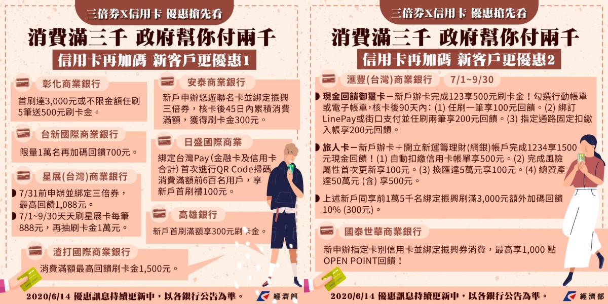 新戶:7月1日至8月31日,新申辦任一張信用卡,並於9月30日前刷滿3000元振興券,即可享有刷卡金500元回饋
