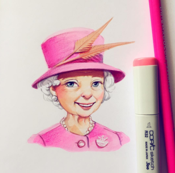 英國女皇伊莉莎白二世(Elizabeth II)最常穿著各種顏色的套裝,搭配上同色系的帽子和配件出席各大場合!插畫裡的粉紅套裝也好適合優雅大方的英國女皇啊!