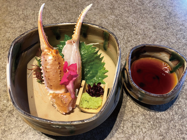一進店內會看到水槽裡的活蟹,搭電梯到樓上,室內庭園造景與日式包廂座位,讓人感到平靜舒適,午餐供應到16:00 為止,「會席料理」價位從4,000 ∼ 6,000 日幣不等。想要更豪華的享受,還有季節限定「特別會席」可選擇,午餐一人8,000 日幣以內。從生食、焗烤、天婦羅、壽司、火鍋、中華料理作法,新鮮的蟹腳全餐讓人吃得好過癮!最貼心的是用餐結束後,店員會送上附著檸檬片的擦手巾,讓顧客的手指完全不會殘留海鮮味。