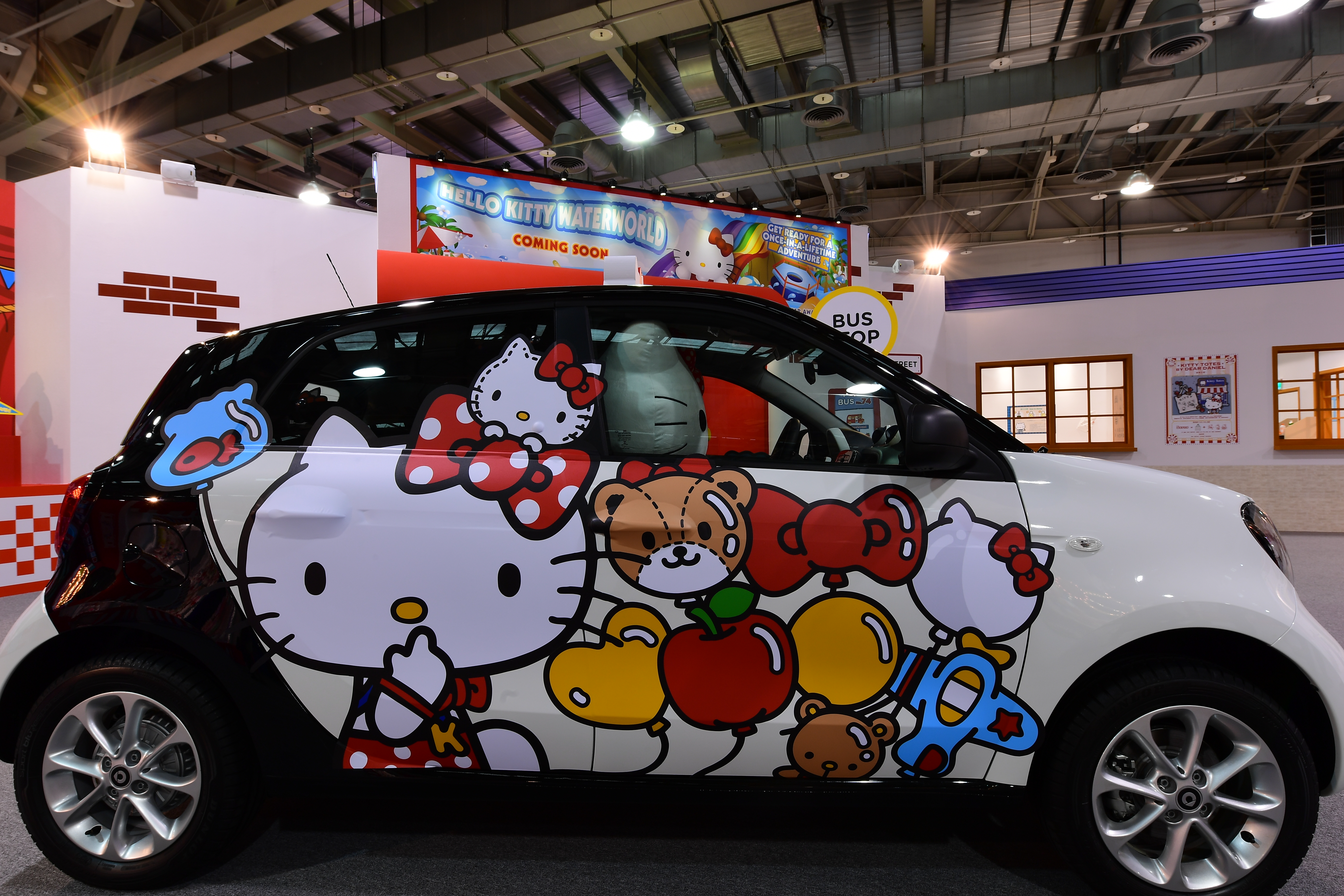 「Hello Kitty Go Around!!歡樂嘉年華」特展於十月預售票一開賣,即受到粉絲熱烈的迴響,官方釋出的各種場景介紹更在網路上吸引了無數粉絲的討論及關注。今日搶先的體驗場,主辦單位實景呈現各個夢幻場景,有華麗的旋轉木馬、夢幻摩天輪及充滿兒時趣味的回憶花園等,皆讓入場民眾無一不讚嘆其精緻程度,紛紛搶著與經典場景及各個人氣肖像拍照紀念。不僅如此,主辦單位還與台灣賓士攜手為粉絲帶來額外的驚喜,旗下的知名小車Smart特別為此次展覽換上新裝,明亮的限定設計,讓經典的Smart小車更顯活潑,現場粉絲也都直呼超可愛,超想把車直接打包帶走。