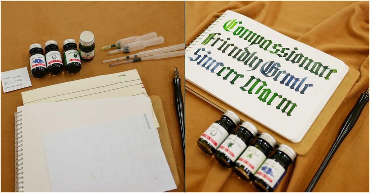 1.沾水筆:因為要寫的字體是歌德體,挑選使用的工具是平尖4mm寬的沾水筆,沾水筆換顏色十分方便喔。
