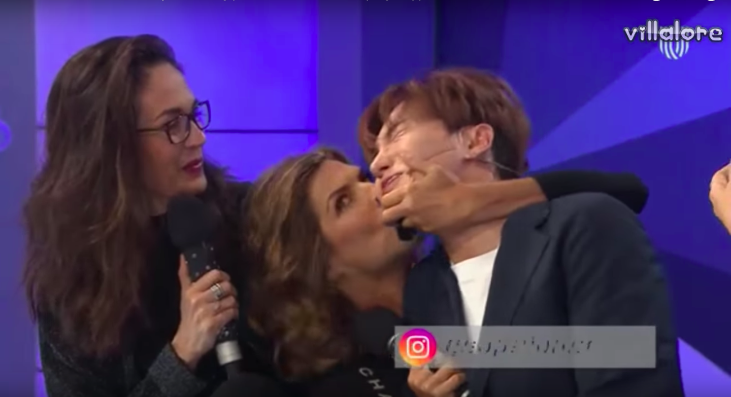 一頭捲髮的這位女主持人在節目中先叫隊長利特坐在他的大腿上,在聊天之間突然強行將利特的臉壓向自己,突擊「BOBO臉頰」!不只成員、連坐在一旁的其他節目人員(還有翻譯人員)也嚇到發出驚呼,看得出來並非事先SET好的橋段,當然鏡頭上也捕捉到利特受到驚嚇、緊閉雙眼的表情,沒想到之後還有更失控的舉動…