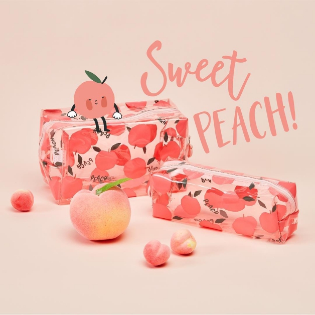 首先登場的是容量大的「化妝包」,外觀被滿滿的水蜜桃包圍,拉鍊上則有小小的PEACH LOGO,可愛又不失質感,拿來當外出用化妝包再適合不過了,有中和小兩個尺寸供妞妞們選擇!