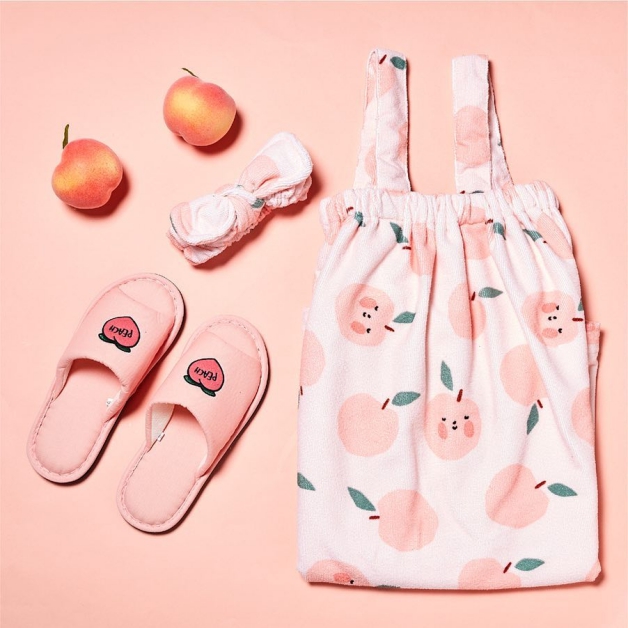居家系列則有包包、室內拖鞋、髮帶和沐浴球,特別是沐浴球還做成「水蜜桃」的形狀,連上面的葉子小細節都沒放過,整體粉嫩~粉嫩的~