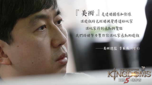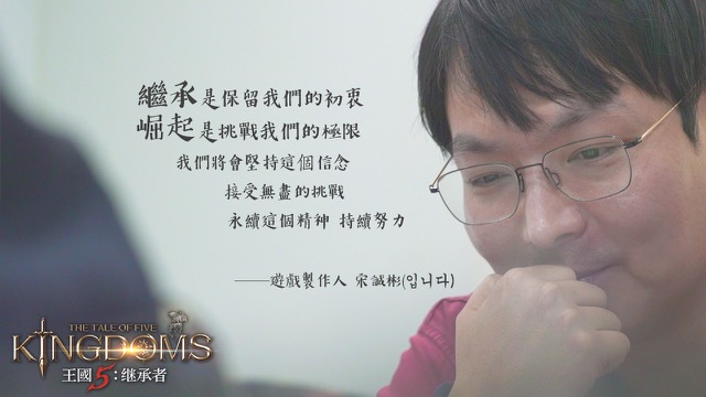 製作人 宋誠彬:《王國5:繼承者》這款遊戲從規劃確立到完成大概花了3年時間來製作,這期間我們動用了80多的研發人員,其中包括了企劃、美術、3D動態製作和系統技術同仁。我們喜歡突破極限,所以這次挑戰希望將以往無法在手機畫面上呈現的華麗效果與更細膩的動作,能在這款遊戲中完整呈現。突破這些不可能,對我們來說有相當大的意義。