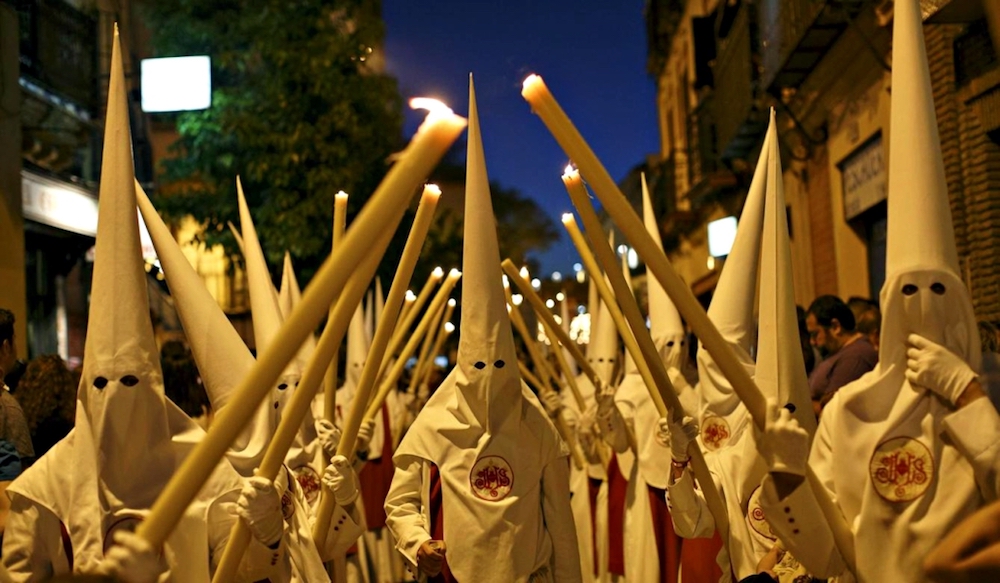 每年3~4月(日期不定)西班牙會舉行為期一週的「聖週」(又稱復活節,Semana Santa),其中以塞維亞的聖週最盛大也最知名。節日的高潮是聖母與基督像遊行,為紀念耶穌受難,多達數十個教會團體肩扛華麗神轎繞行城市,當地女子則會戴上黑色頭巾,而遊行隊伍中頭戴尖帽身披斗篷的是「懺悔者」,相傳古時上教堂告解認罪的人,為了不被認出,就會披上這身裝束。許多信仰虔誠的西班牙人會跟著遊行隊伍一路哭泣,並且全程不發一語,直到慶典結束。