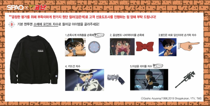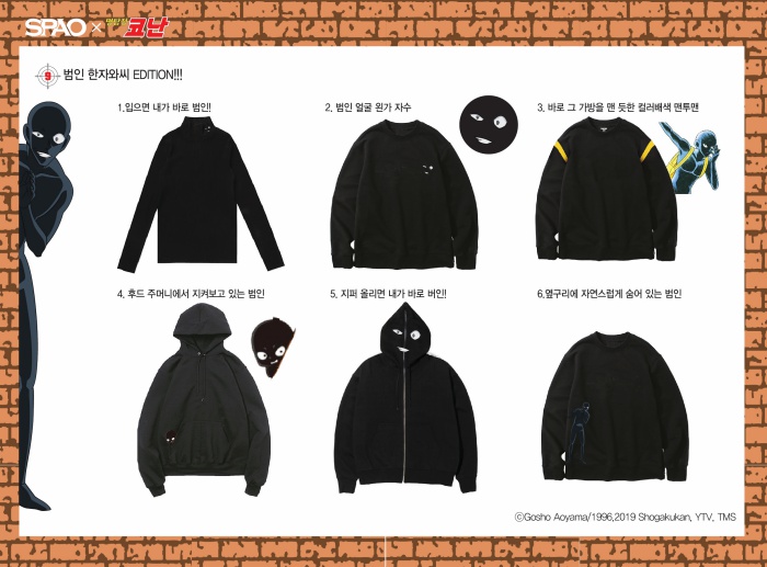 在《名偵探柯南》的漫長連載故事中,柯南、怪盜基德、新人氣王安室透亦敵亦友的關係是一大看點,SPAO這波聯名以黑色大學T款式為主,把三人在動畫中出現的經典元素列入票選啦!縮小藥丸「APTX4869」、偵探徽章、領結型變聲器、增強踢力球鞋、手錶型麻醉槍、太陽能噴射滑板…這些柯南的小道具都能PICK,基德則是招牌單片眼鏡、撲克牌、白色禮帽、撲克牌槍,而安室透的咖啡店LOGO、引發轟動的「安室三明治」也在選項內,啊啊!要選擇障礙發作啦~(還有柯南著名的手指是怎樣XD)