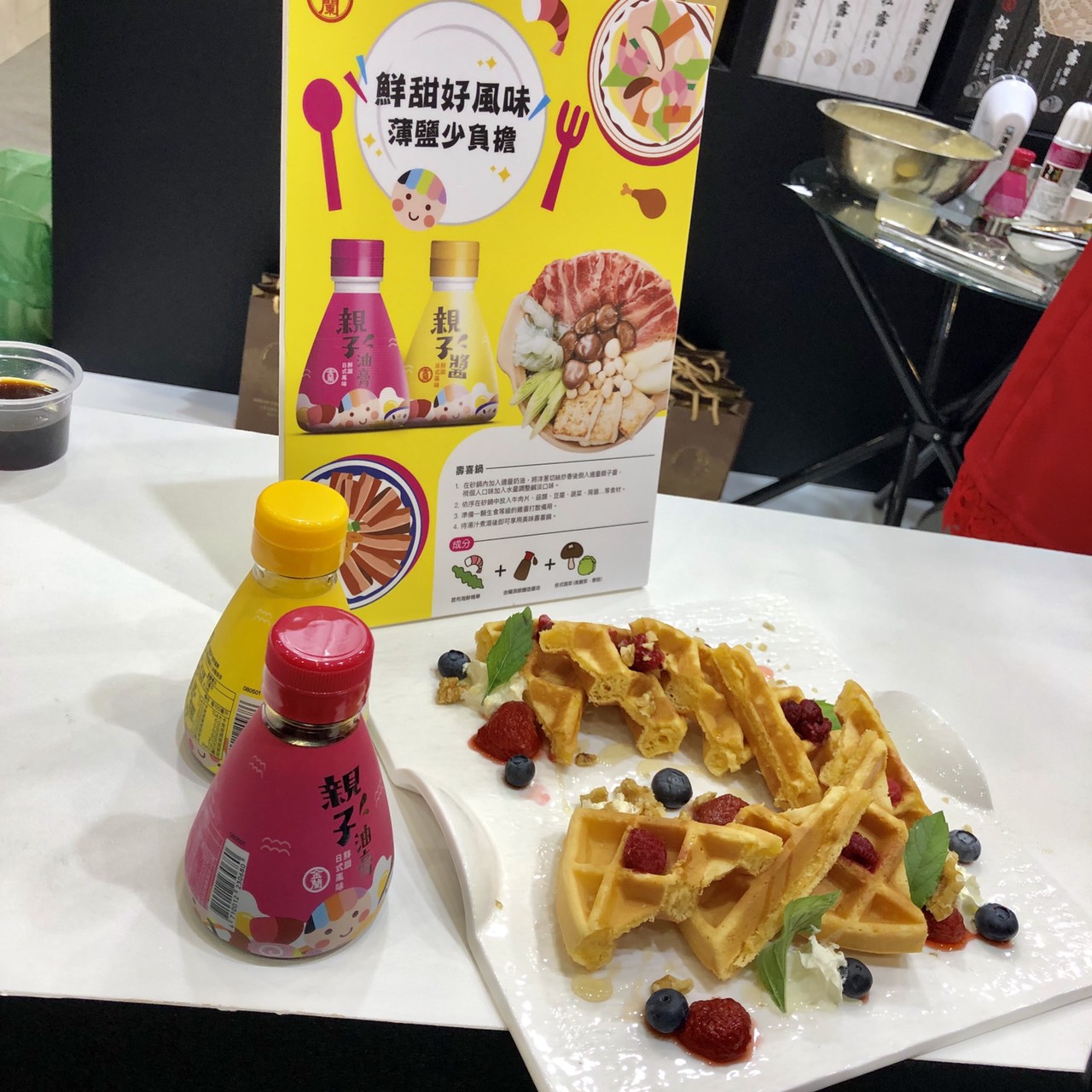 名廚爸爸魏韶璞先生示範的「親子雞肉丼」,在日本是深受小朋友喜愛的菜色,使用金蘭親子系列,就能省去調醬的功夫,不必花很多時間調整醬料口味,很適合不擅廚藝及工作家庭兩頭燒的家庭烹調。魏韶璞精心設計的甜點菜色-「親子醬莓果鬆餅」,是參考日本當地以鹽或醬油來提味的甜品,像是鯛魚燒、銅鑼燒、霜淇淋,都能因醬油而美味,因而設計出改良的鹹口味鬆餅食譜,鹹鬆餅烤好後,可再加綜合莓果,擠些植物鮮奶油,最後再淋楓糖漿、灑堅果,放薄荷葉即可。