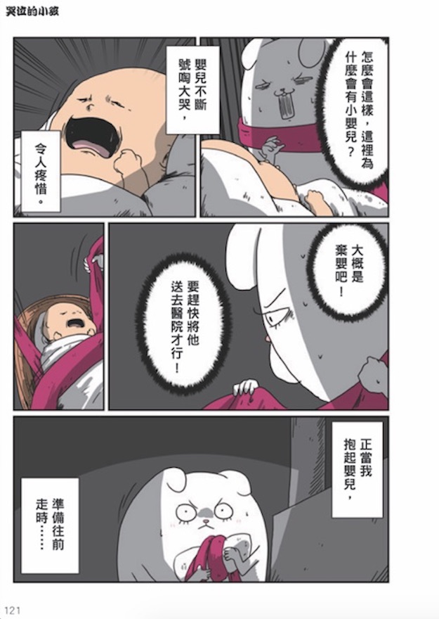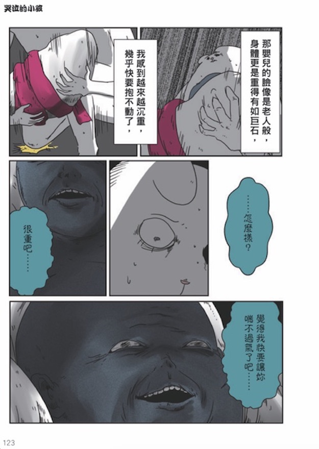 ◆懷中的兒啼爺有張恐怖老臉,還越來越重……