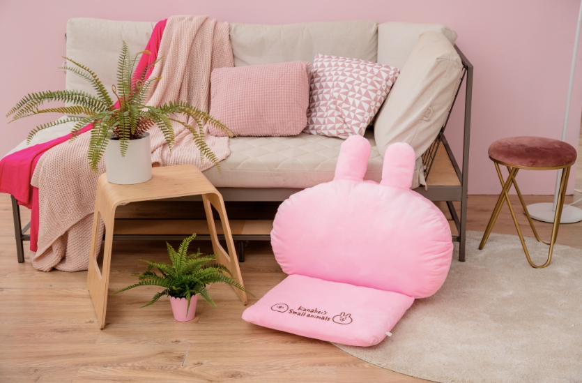 獨特開發的粉紅兔兔造型,靠枕是約75公分的粉紅兔兔大頭,坐墊是舒適的絨面,窩在上面追劇、滑手機超放鬆。限量1200個。