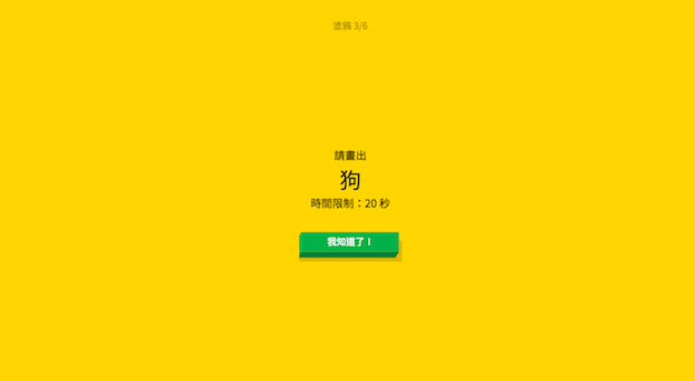 遊戲關卡共計6關,如果在20秒結束之前,成功讓A.I.辨識出來你所畫的物品,就會提前進入下一個關卡,如果到時間結束還是沒畫出來,還是會進入下一關,只不過這一關就會以失敗收場。