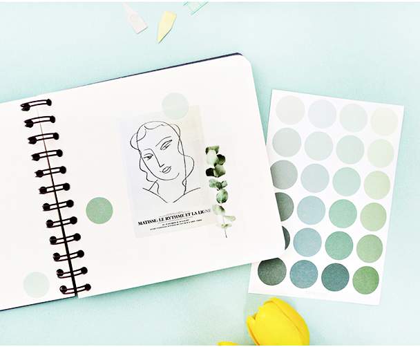 貼紙造型就如同調色盤一樣,圓圓的造型搭上漸層顏色,唯美的色階讓強迫症看了表示很紓壓。顏色以紫色、粉紅、藍色、玫瑰、黃色、橄欖、綠、灰等八色為基本色,每張貼紙共有24個漸變色,如果打包全部的顏色,就有192種顏色貼紙可使用。