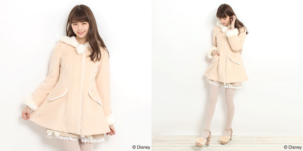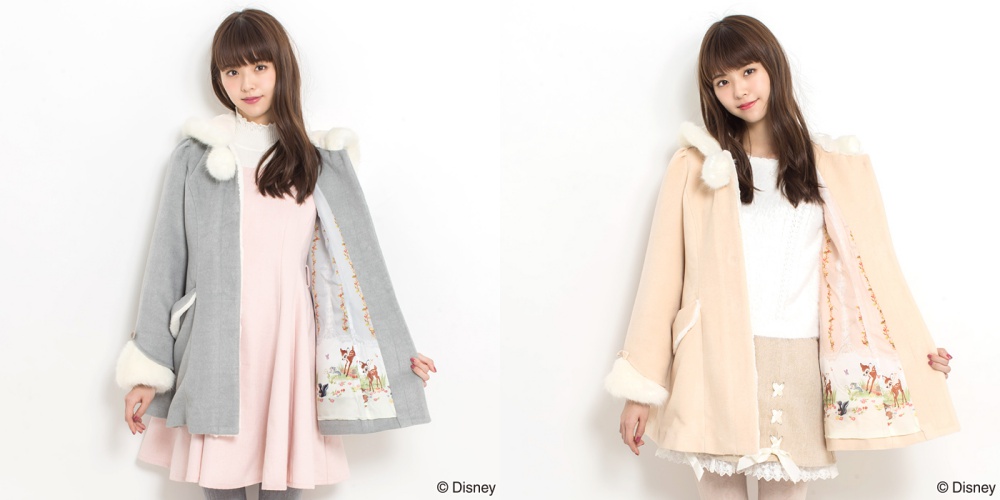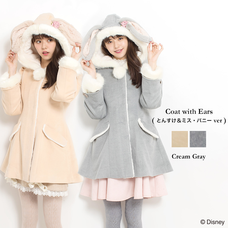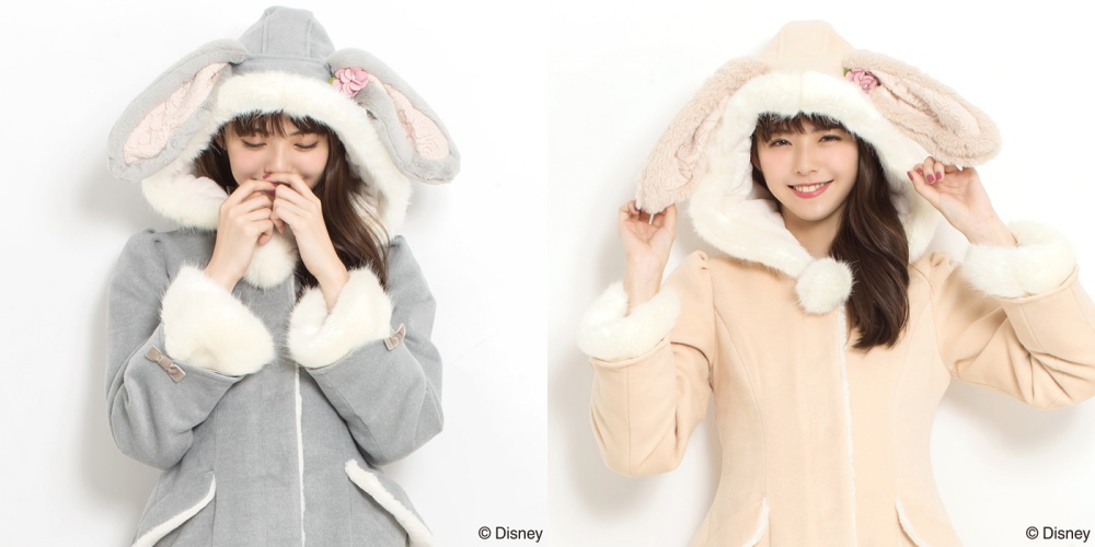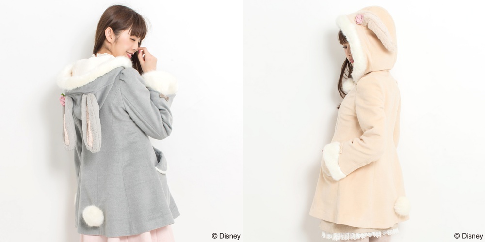 日本服飾品牌Secret Honey以迪士尼電影《小鹿斑比》中的小兔子情侶桑普和邦妮為原型,設計了這款兔子耳朵大衣。有灰色和奶油色兩色,整件外套充滿毛茸茸的元素,妞編輯整個被萌到嫑嫑的啊!
