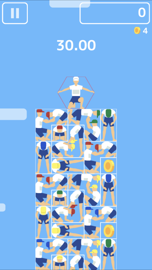 好,讓我們開始破壞這座塔吧!遊戲玩法非常簡單,玩家的目標就是要消去被白色框框圈起來的人體方塊,讓最頂端的六角型人體主方塊安全地慢慢往下降落。如果讓它跌落到塔之外,就會Game Over!(但一般的人方塊倒塌就沒關係)(有想過一般方塊的感受嗎QQ)