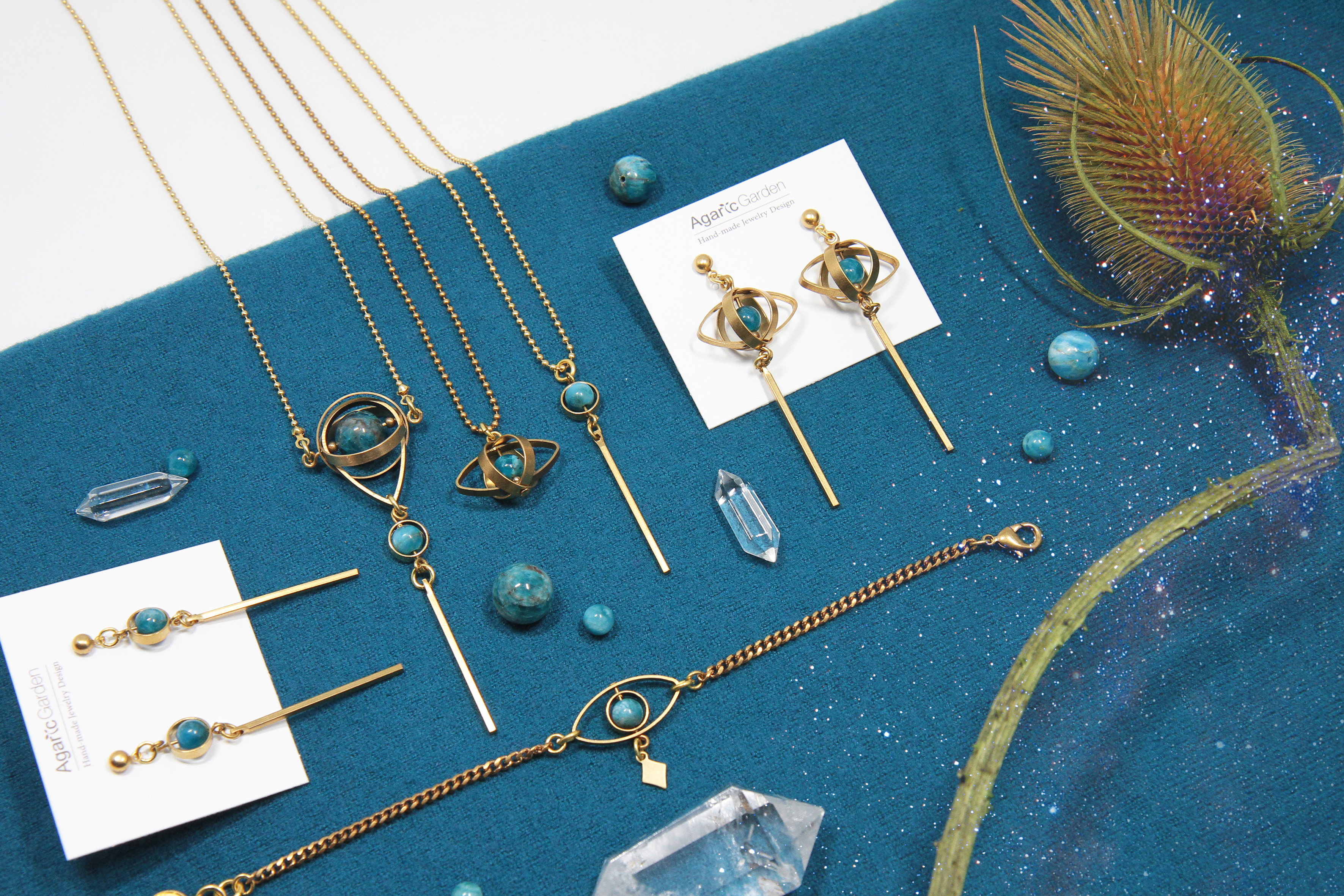 如果來不及體驗手作課程,也可以到飾品店選購有特色的首飾。艾格瑞的飾品外型以幾何造型結合礦石,在這裡還有限定系列商品「荷魯斯之眼」。荷魯斯之眼是神話傳說中鷹頭神荷魯斯的眼睛,被埃及人用來當成避邪、辨別善惡忠堅、得到健康與幸福的護身符,而這款飾品搭配湛藍的藍磷灰石,即有著穩定情緒、平穩心情的意涵,是一組因神秘烏托邦所誕生的首飾配件。