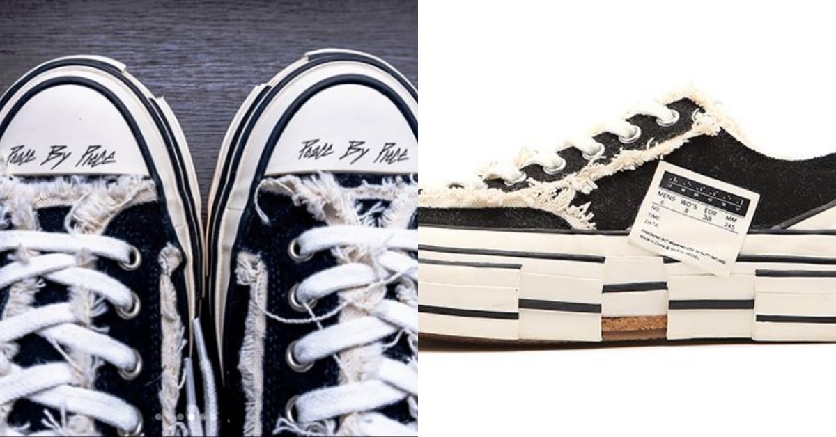 雖然這雙鞋很類似我們熟悉的Converse,但從鞋身、鞋面甚至到鞋邊的橡膠都呈現拼接、破壞、抽鬚的街頭層次感,仔細看層層疊疊的鞋側還露出使用軟木的中底設計,鞋身還直接貼上尺碼標籤,鞋頭上的草寫英文「Peace by Piece」更是直接又完整的說明這雙鞋的宗旨!