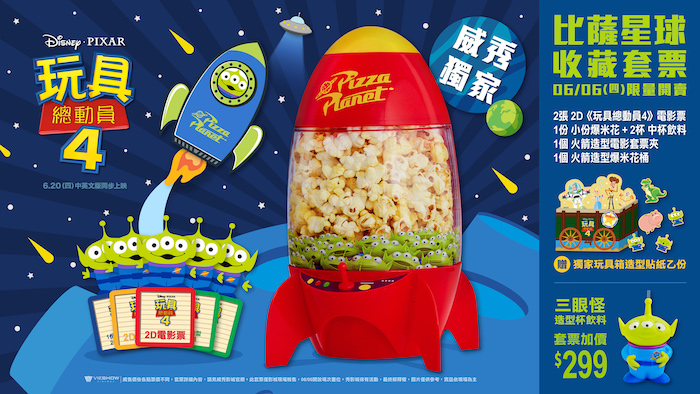 另外威秀影城也推出限量的「比薩星球收藏套票」,電影票卡就特別設計成三眼怪的造型,還能將電影票卡存放於火箭封套中,非常具有紀念價值,而購買此套票,還能再獲得威秀影城獨家「玩具箱造型貼紙乙份」。