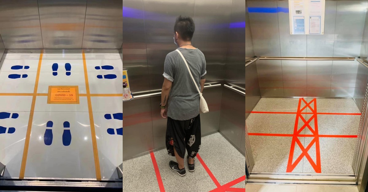 即使疫情始終沒有緩和的跡象,泰國人樂天的個性也是不減,除了佛系的口罩以外,百貨公司也開始了「佛系」的防疫方式,在電梯內貼出了九宮格,讓所有人面壁思過(?!),防止大家接觸傳染,也不讓人面對面散播病毒,乍看之下其實蠻有趣的~(不過要怎麼知道現在到幾樓了?)