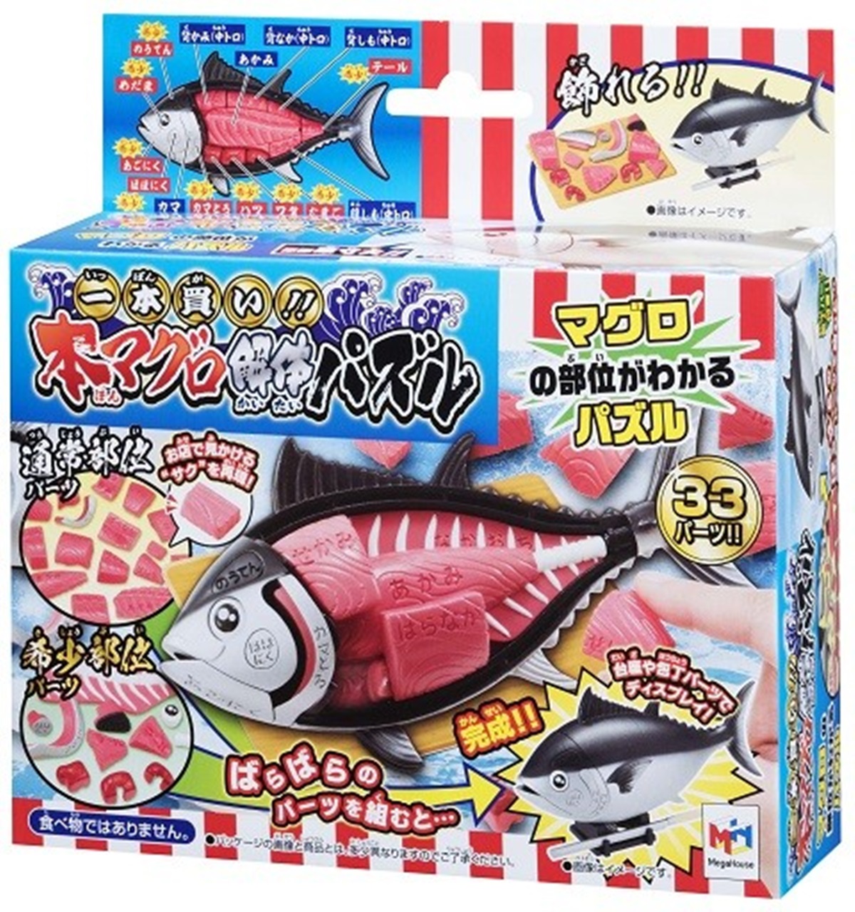 這套立體拼圖共有33個部位,還附有魚刀和砧板與教學手冊,可以自己當壽司師傅來料理魚。且拼圖時要照著一定順序才能順利拼完,拼完後鮪魚達人就是你囉~
