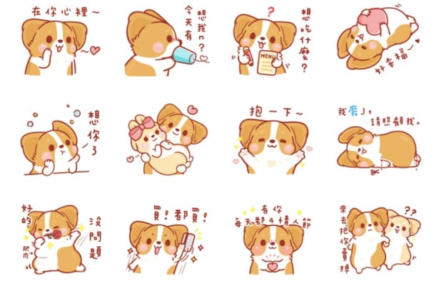 再來也是撒嬌女友款,強推給喜歡柯基的女朋友們!這款貼圖撒嬌程度真的超~高~傳給男友,他不心動才怪!手機小姐大愛「陪我嘛」、「煩你煩你」這兩張貼圖,既可愛又適合用來刷存在感。(笑)