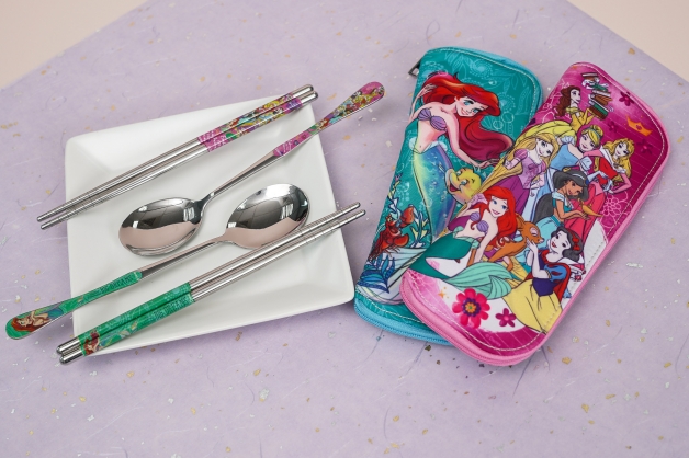 「公主系列環保餐具」這次特別推出兩款,分別為「夢幻公主全系列」和「《小美人魚》愛麗兒」,夢幻公主系列集結所有公主,底色為桃紅色;《小美人魚》愛麗兒則是以人魚公主為主角,底色為海底綠,帆布外層方便清洗,內含有筷子和湯匙呢!