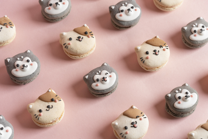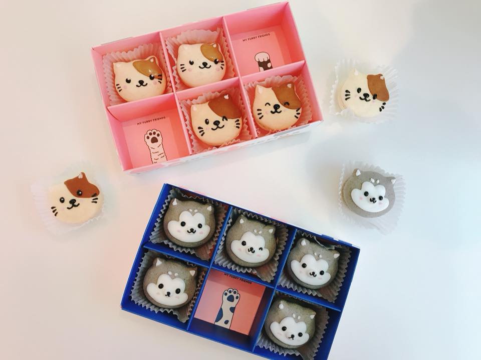 口味內餡部分,都是選用美國進口藍鑽杏仁粉,狗狗的是巧克力甘納許,而貓咪的是覆盆子草莓,兩款嚐起來口感都很不錯、不會過於死甜。